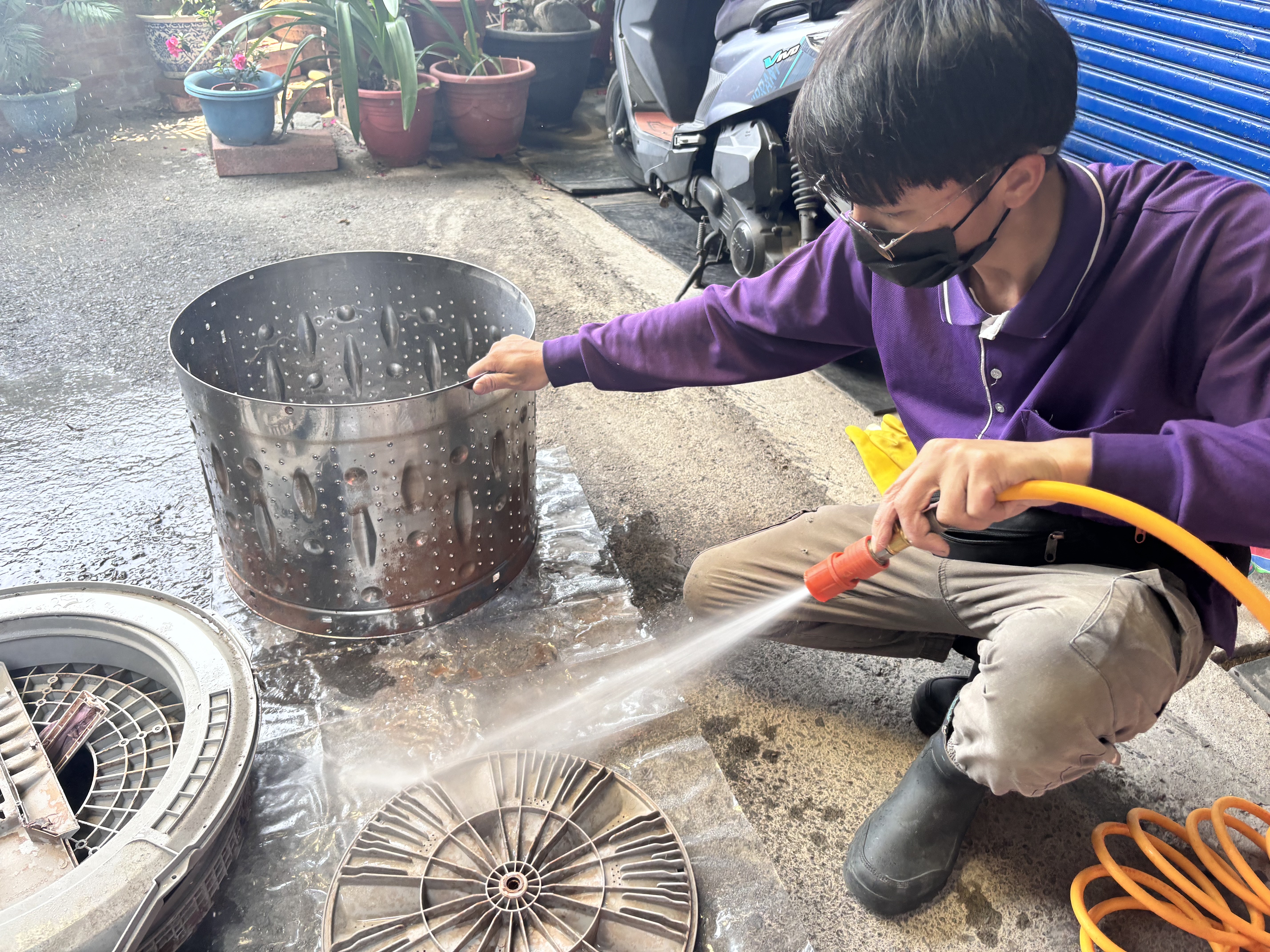 洗衣機底盤縫隙極多,單純刷洗無法深入清潔。淨燁使用專業高壓水槍,針對每個細微方格進行徹底沖洗。